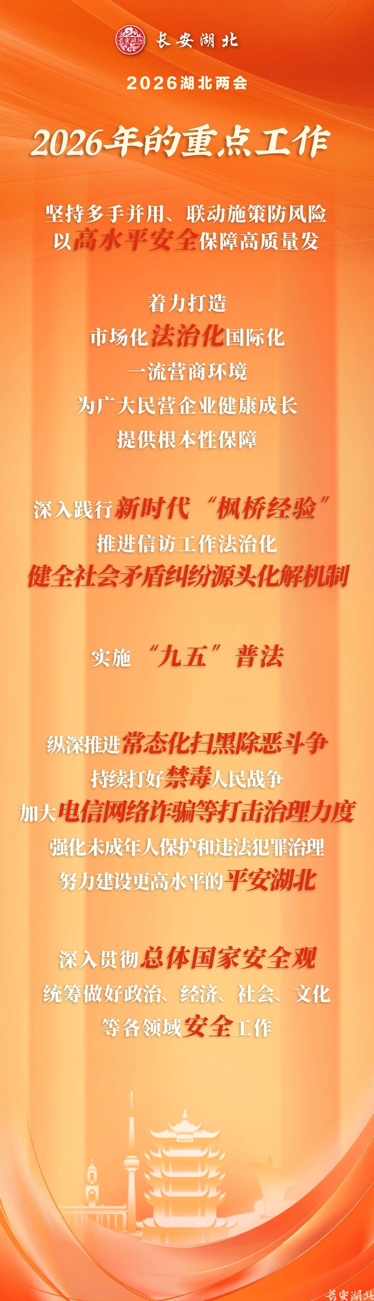 统筹发展和安全,持续优化社会治理,深入践行新时代“枫桥经验”,荆楚大地呈现人民安居乐业、社会安定有序的良好局面……