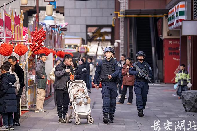 ▲浙江省长兴县公安局巡特警大队积极开展街面巡逻工作,全力筑牢新春安全防线。图为2月11日,巡特警队员在人员密集场所开展武装巡逻。方金华摄(法治日报)