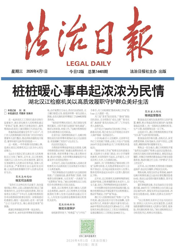 《法治日报》记者从湖北省人民检察院汉江分院了解到,近年来,汉江检察机关践行以人民为中心的发展思想,紧盯民生领域事关人民群众切身利益、侵害人民合法权益、严重损害社会公益的突出问题,以高质效检察履职守护人民群众的美好生活。